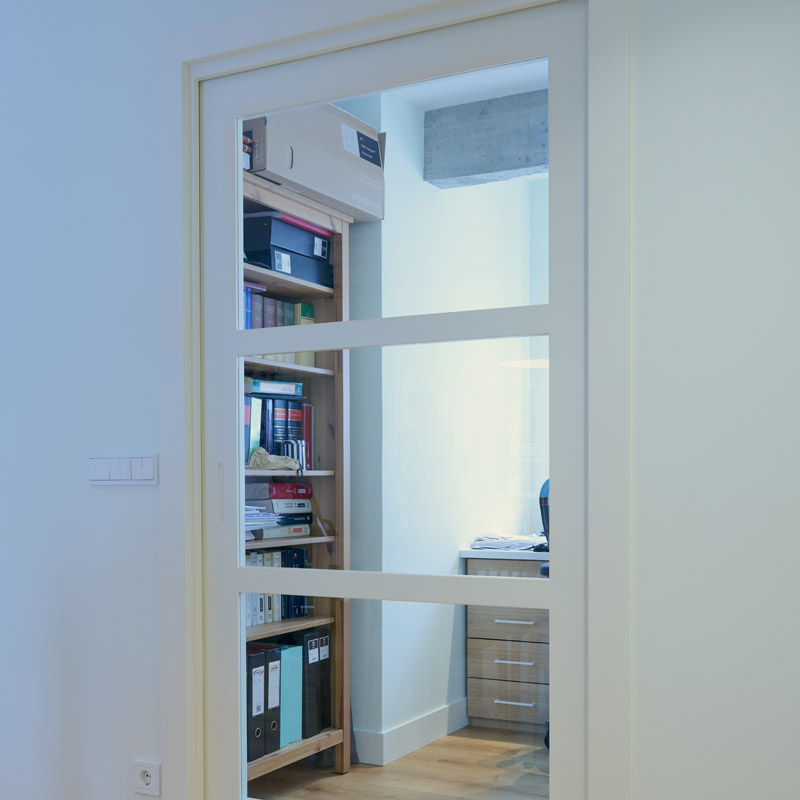 Puerta Vidriera Exclusiva con Uñero Mecanizado: Destacamos una de nuestras creaciones más exclusivas: una puerta vidriera diseñada y fabricada completamente en nuestro taller. Cada detalle, desde el uñero mecanizado hasta el vidrio utilizado, se selecciona con precisión para garantizar que esta puerta sea una obra de arte que enriquece cualquier entorno, como un despacho en una vivienda.