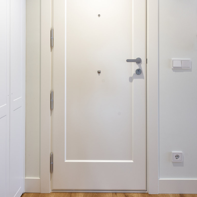 Puerta de Entrada Mixta Modelo Castalla: con una impresionante combinación de exterior en sapelly e interior a juego con las puertas interiores. Estas puertas no solo ofrecen un aspecto uniforme y atractivo desde el exterior, sino que también incorporan una cerradura de alta seguridad con 4 vueltas de cierre y una tuerca del pomo diseñada para realzar su estética.